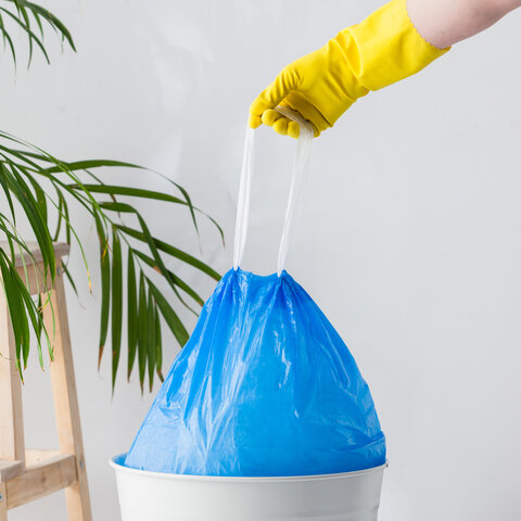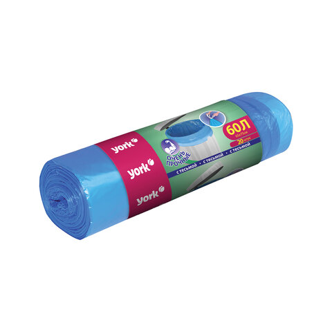 Мешки для мусора с завязками 60л, СУПЕРПЛОТНЫЕ, синие, в рулоне 20шт, ПНД, 18мкм, YORK Затяжки в виде тесьмы позволяют быстро и аккуратно извлекать мешок из мусорного ведра и облегчают его транспортировку. Плотные, не порвутся. Для дома или офиса