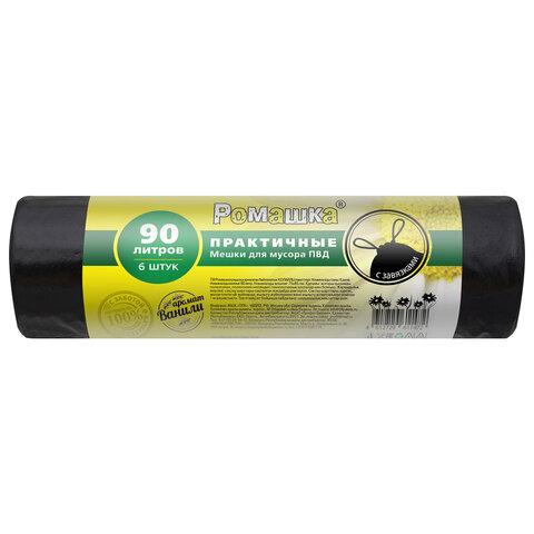 Мешки для мусора с завязками 90 л, черные, в рулоне 6 шт., ПВД 45 мкм, 75х85 см, РОМАШКА, ЗВП-90/6/15Ч