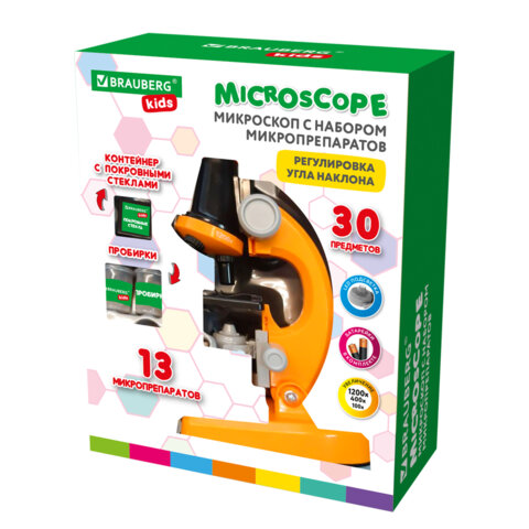 Микроскоп с подсветкой, 30 предметов, в т.ч. набор из 12 микропрепаратов в подарок, увеличение 100х, 400х, 1200х, BRAUBERG KIDS, 391400
