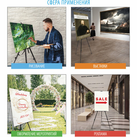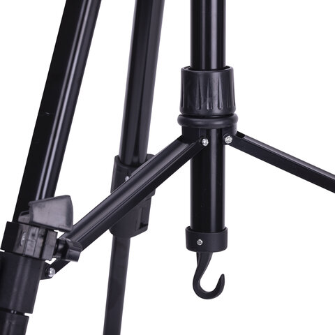 Мольберт BRAUBERG оснащен крючком, на который можно подвесить ведро с краской или груз для придания устойчивости. Выдвижные ножки оснащены зажимами-клипсами, как у современных фотоштативов, благодаря чему установка мольберта производится очень быстро.
