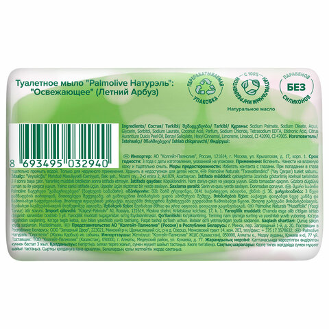 Мыло туалетное 90 г PALMOLIVE НАТУРЭЛЬ "Летний арбуз" освежающее с летним арбузом содержит увлажняющие компоненты и придает мягкость вашей коже.