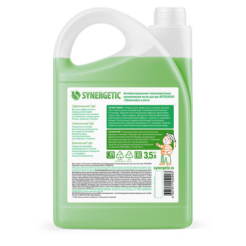 Мыло жидкое антибактериальное 3,5 л SYNERGETIC "Лемонграсс и мята", антизапах, 105201