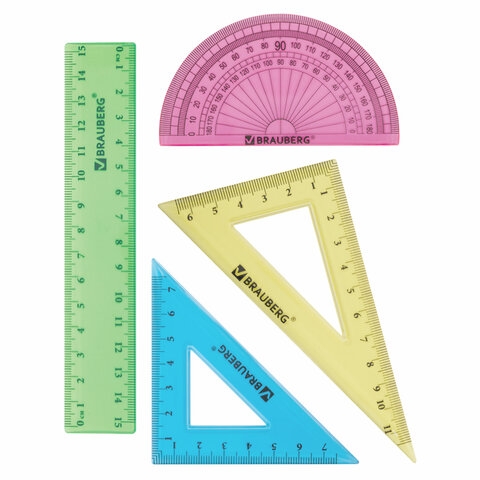 Набор чертежный малый BRAUBERG "Crystal" (линейка 15 см, 2 угольника, транспортир), цветной, 210295