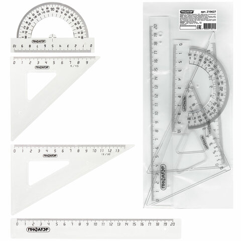 Набор чертежный средний ПИФАГОР (линейка 20 см, 2 треугольника, транспортир), прозрачный, бесцветный, пакет, 210627