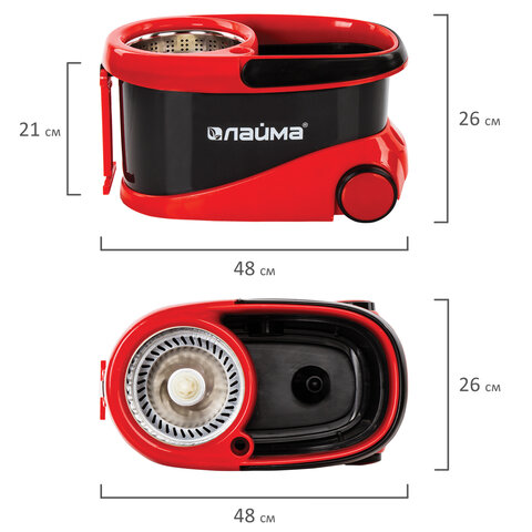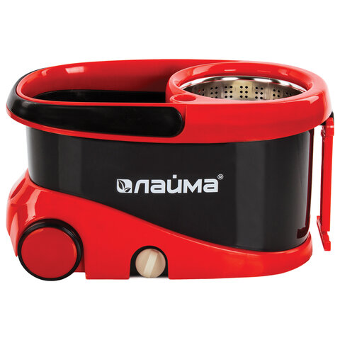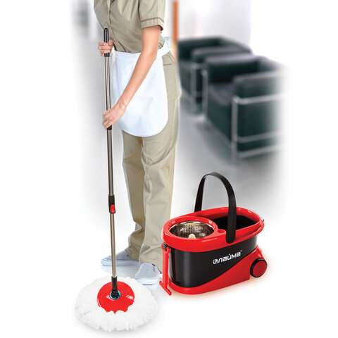 Швабра с отжимом и ведром 19л/9л на колесах и ручкой для перевозки, отжим центрифуга, 2 круглые насадки, черно-красный, LAIMA, 606303, M029B