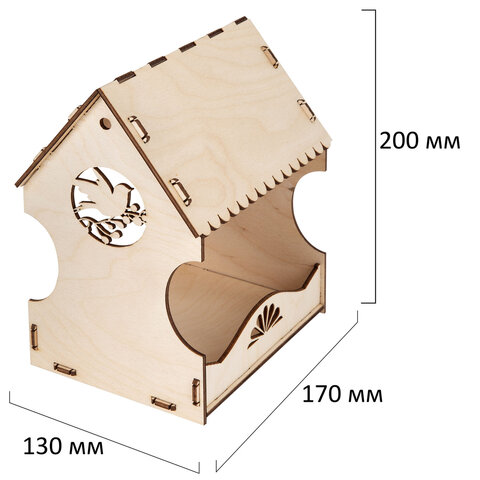 Кормушка для птиц "Рябинка" поставляется в разобранном виде, возможна сборка без клея и молотка. Все детали выполнены из качественной, шлифованной фанеры. Готовое изделие можно раскрасить акриловыми и гуашевыми красками или покрыть лаком.