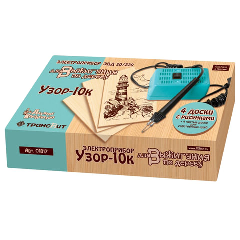 Набор, состоящий из выжигателя и восьми дощечек, предназначен для выжигания художественных узоров, рисунков и изображений на деревянных поверхностях и коже. Специальная подставка в наборе обеспечивает дополнительное удобство применения.