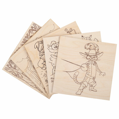 Заготовки деревянные для выжигания "Сказочные мотивы", 5 шт., 10 рисунков, 15х15 см, BRAUBERG HOBBY, 665306