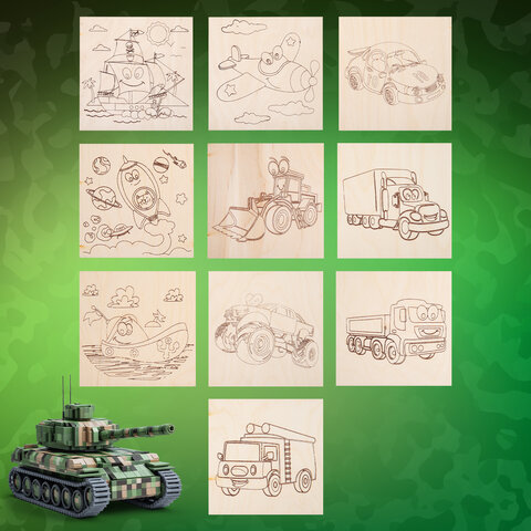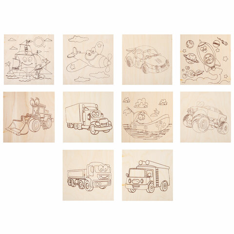 Заготовки деревянные для выжигания "Транспорт", 5 шт., 10 рисунков, 15х15 см, BRAUBERG HOBBY, 665305