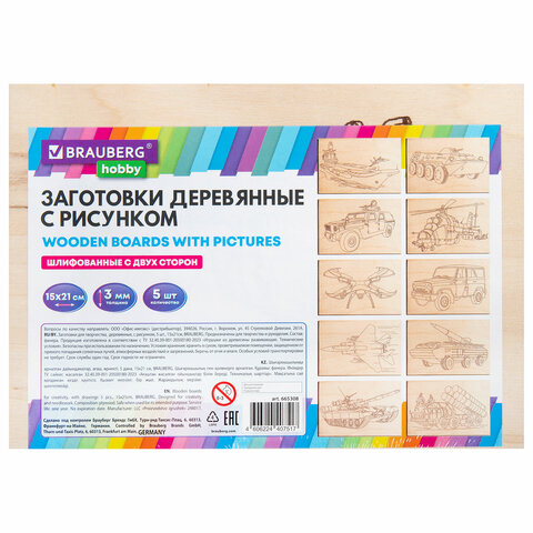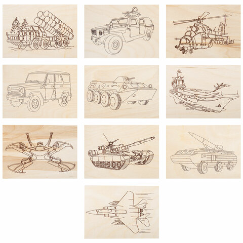 Заготовки деревянные для выжигания "Военная техника", 5 шт., 10 рисунков, 15х21 см, BRAUBERG HOBBY, 665308