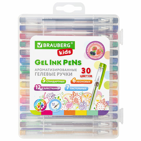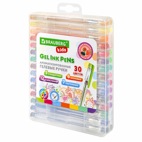 Ручки гелевые АРОМАТИЗИРОВАННЫЕ, НАБОР 30 ЦВЕТОВ, "FRUITS", линия письма 0,5 мм, BRAUBERG KIDS, 143823