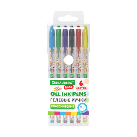 Ручки гелевые КЛАССИЧЕСКИЕ BRAUBERG KIDS "CUTE ANIMALS", НАБОР 6 ЦВЕТОВ, корпус с печатью, узел 1 мм, линия письма 0,7 мм, 144441