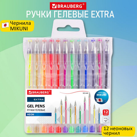 Ручки гелевые НЕОН BRAUBERG "EXTRA", НАБОР 12 ЦВЕТОВ, узел 0,7 мм, линия 0,5 мм, 143912