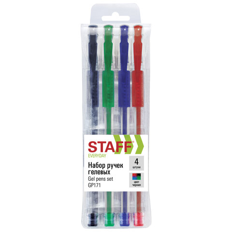 Ручки гелевые с грипом STAFF "EVERYDAY" GP-171, НАБОР 4 ЦВЕТА, узел 0,5 мм, линия письма 0,35 мм, 141826