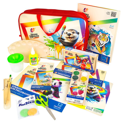 Подарочный набор для творчества ЛУЧ "Школа творчества" состоит из различных канцелярских товаров, которые упакованы в удобную для переноски красочную папку на молнии с двумя ручками. Все они включены в обязательный список покупок к школе.
