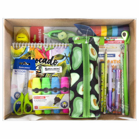 Большой набор канцелярских принадлежностей BRAUBERG "AVOCADO" в подарочной упаковке скомпонован из самых необходимых предметов одной тематики, за счет чего смотрится ярко и и интересно.