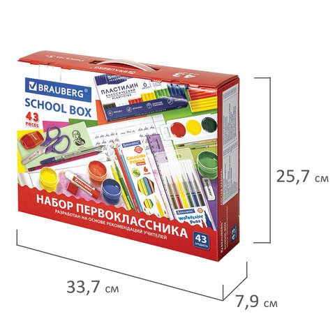 Набор школьных принадлежностей в подарочной коробке BRAUBERG "ПЕРВОКЛАССНИК 43 предмета", 880949