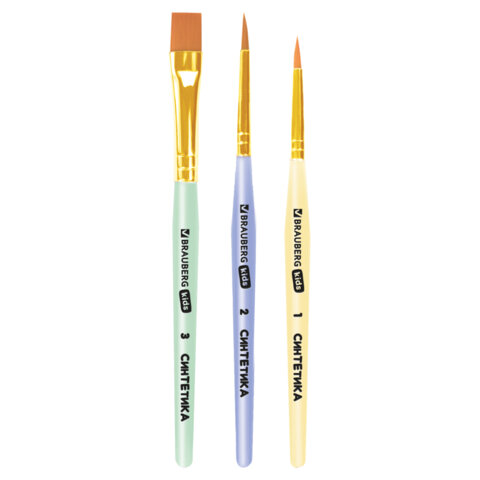 Кисти СИНТЕТИКА набор 3 шт. (круглые № 1, 2, плоская № 3), пакет с европодвесом, BRAUBERG KIDS, 201078