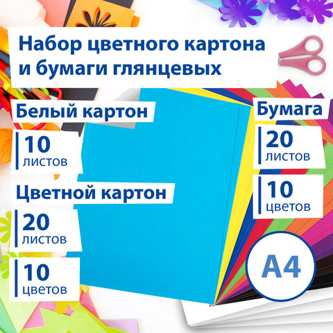 Набор картона и бумаги A4 мелованные (белый 10 л., цветной и бумага по 20 л.,10 цветов), BRAUBERG, 113567