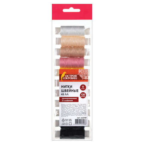 Набор швейных ниток, 11 цветов по 120 м, армированные, 45 ЛЛ, ОСТРОВ СОКРОВИЩ, 662789