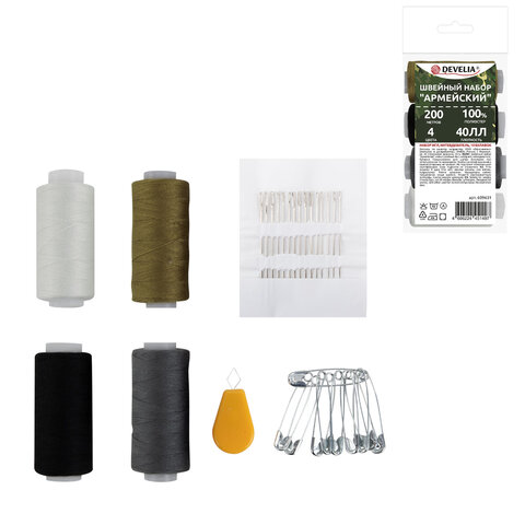 Набор швейный "Армейский", 40 ЛЛ, 200 м, 4 цвета, иглы, нитевдеватель, булавки, DEVELIA (Девелиа), 609631