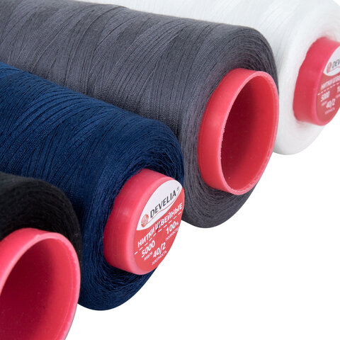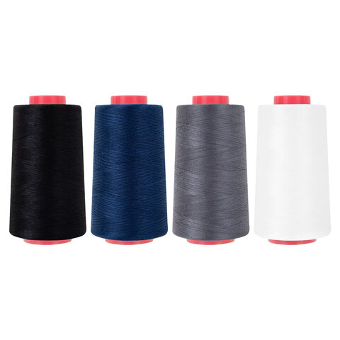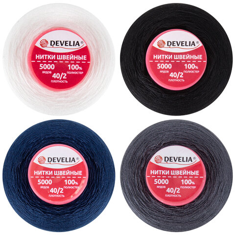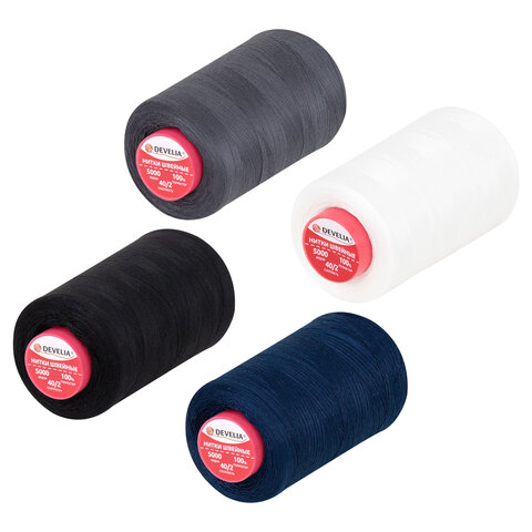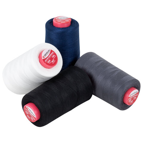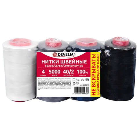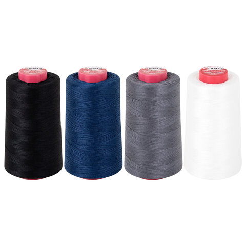 Нитки швейные 40/2 5000 ярд. (4572 м), Набор 4 цвета, белый/серый/синий/черный, DEVELIA (ДЕВЕЛИА), 665619