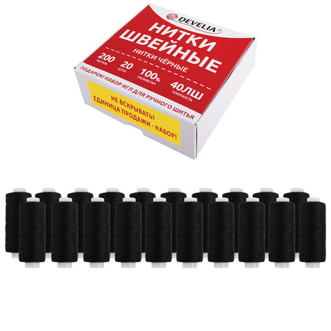 Нитки швейные 40 ЛШ, 200 м, полиэстер, НАБОР 20 шт., черные, в ПОДАРОК иглы, DEVELIA (Девелиа), 609622