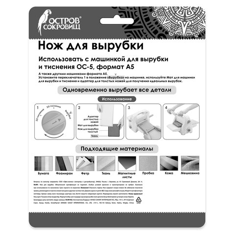 Ножи для вырубки ОСТРОВ СОКРОВИЩ - это пластины с мощными фигурными ножами, позволяющие легко и быстро создавать вырубки из множества различных материалов: картон, фоамиран, фетр, кожа, пробка и другие. Используются с машинкой для вырубки и тиснения ОС-5.