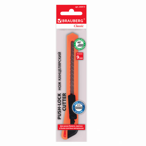 Нож канцелярский 9 мм BRAUBERG "Classic", фиксатор, корпус ассорти, упаковка с европодвесом, 230914