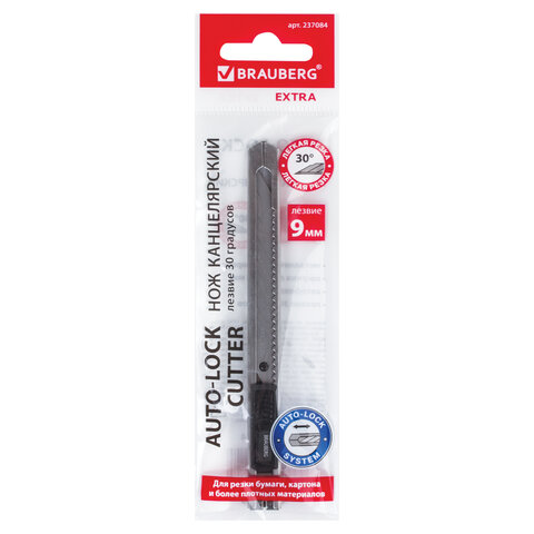 Нож канцелярский 9 мм BRAUBERG "Extra 30", металлический, лезвие 30°, автофиксатор, подвес, 237084