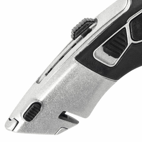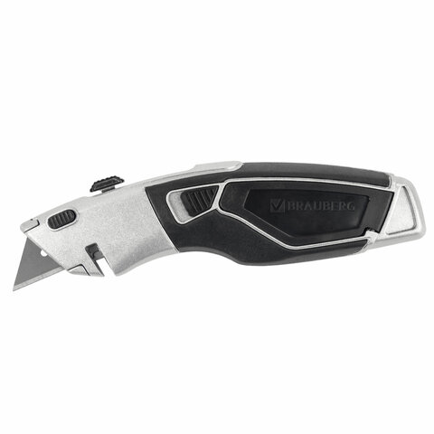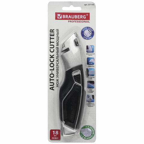 Универсальный мощный нож с фиксатором BRAUBERG - инструмент, который поможет при резке бумаги, пластика, картона и прочих плотных и вязких материалов: линолеума, гипсокартона, ковролина. В корпусе изделия - 3 дополнительных лезвия.