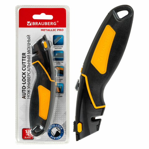 Универсальный мощный нож с автофикстором BRAUBERG – инструмент, который подходит для резки бумаги, пластика, картона, а также более плотных и сложных для резки материалов, таких как линолеум, гипсокартон и ковролин.
