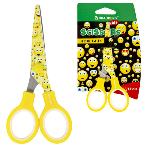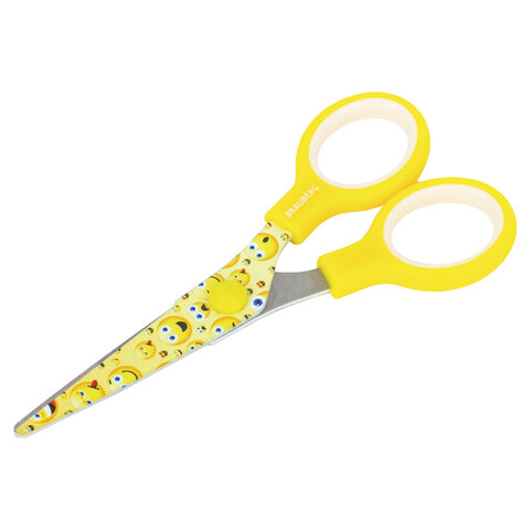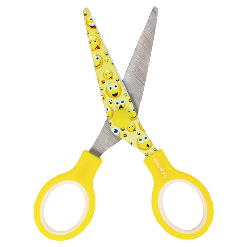 Ножницы 130 мм с цветной печатью "Смайлики", жёлто-белые, закругленные, BRAUBERG KIDS, 232274