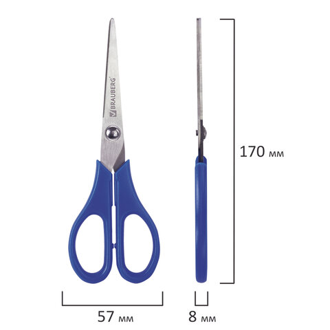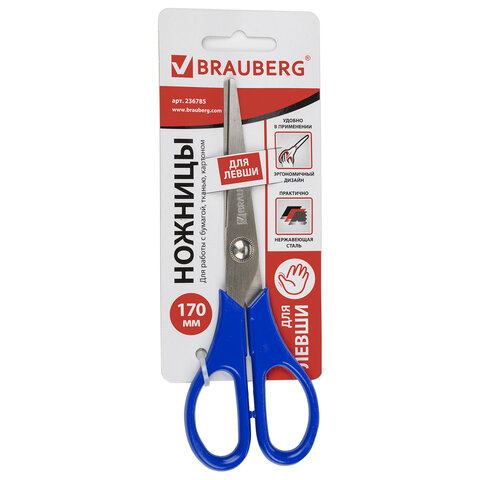Ножницы BRAUBERG для левши "Left hand", 170 мм, синие, 2-х сторонняя заточка, 236785