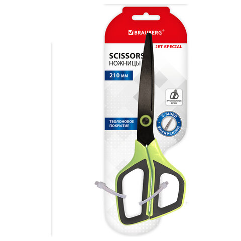 Ножницы BRAUBERG "JET Special", салатовые, 210 мм, 3-сторонняя заточка, тефлоновое покрытие, 238852