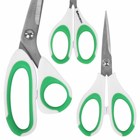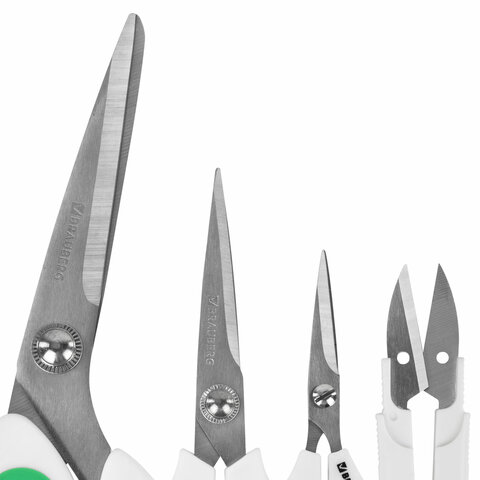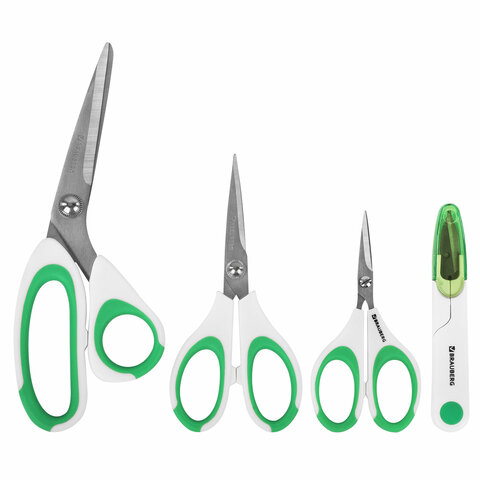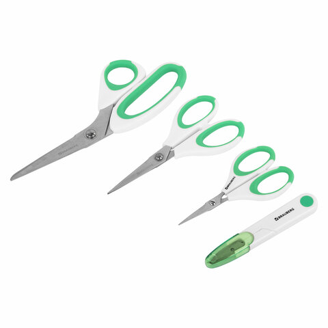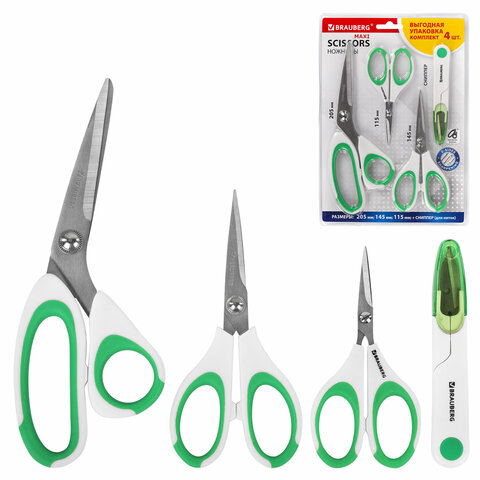 Ножницы BRAUBERG "MAXI" КОМПЛЕКТ 4 шт.: 115, 145, 205 мм + сниппер (для ниток), бело-зеленые ручки, 272982