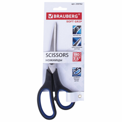Ножницы BRAUBERG "Soft Grip", 190 мм, черно-синие, резиновые вставки, 3-сторонняя заточка, 230762
