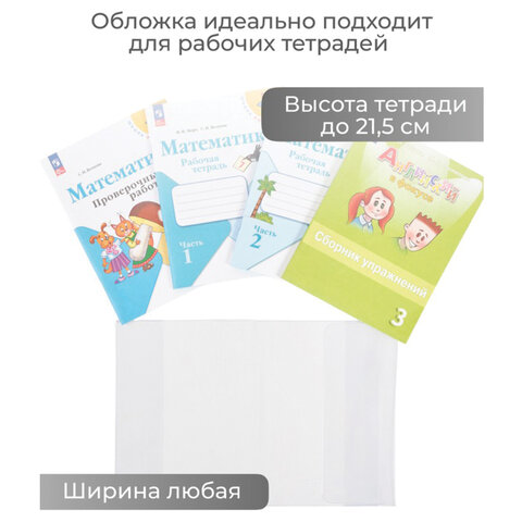 Обложки подходят для учебников в мягком переплете и рабочих тетрадей высотой до 21,5 см. Высокая плотность материала обложки гарантирует долгий срок службы без повреждений. Обложка изготовлена из материала безопасного для детских товаров.
