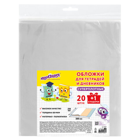 Обложки ПЭ для тетрадей и дневников, НАБОР 20 шт. + 1 шт. в подарок, СУПЕРПЛОТНЫЕ, 150 мкм, 210х350 мм, ЮНЛАНДИЯ, 274107