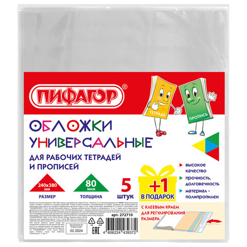 Обложки ПП для рабочих тетрадей и прописей, НАБОР "5 шт. + 1 шт. в ПОДАРОК", 240х380 мм, 80 мкм, универсальные, прозрачные, ПИФАГОР, 272710