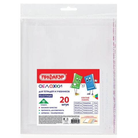 Обложки ПП для тетрадей и учебников, КЛЕЙКИЙ КРАЙ, НАБОР 20 шт., ПЛОТНЫЕ, 80 мкм, ПИФАГОР, 274118