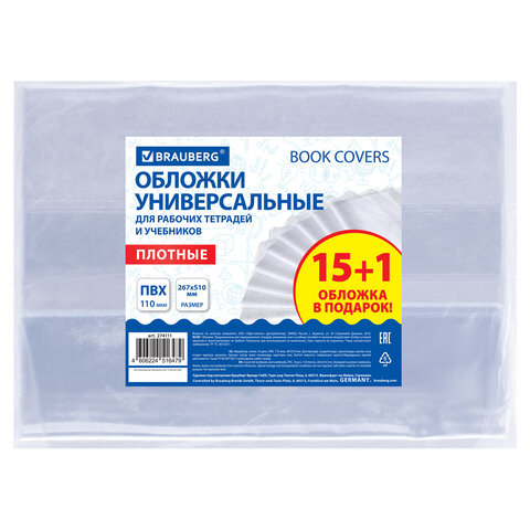 Обложки ПВХ для рабочих тетрадей и учебников, КОМПЛЕКТ 15 шт. + 1 в подарок, ПЛОТНЫЕ, 110 мкм, 267х510 мм, BRAUBERG, 274111