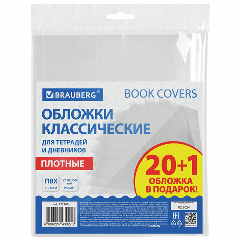 Обложки ПВХ для тетрадей и дневников, "20 шт. +1 шт. в ПОДАРОК", ПЛОТНЫЕ, 110 мкм, 210х350 мм, BRAUBERG, 272700