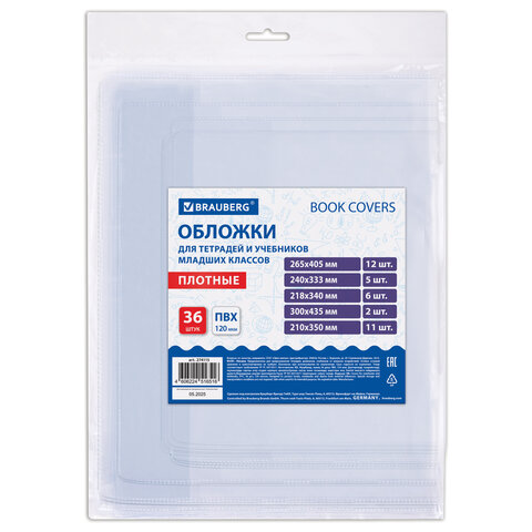 Обложки ПВХ для тетрадей и учебников младших классов, НАБОР 36 шт., ПЛОТНЫЕ, 120 мкм, универсальные, прозрачные, BRAUBERG, 274115