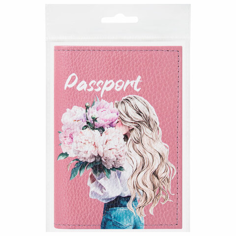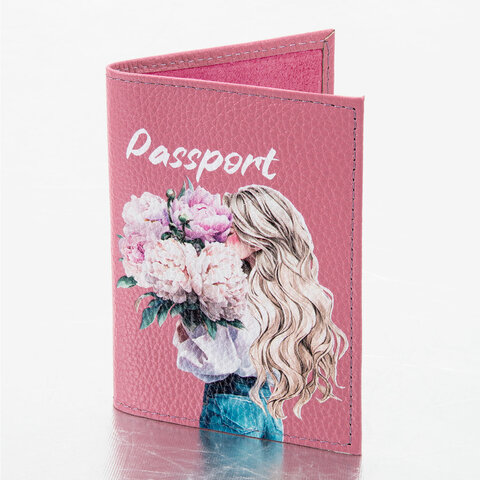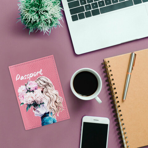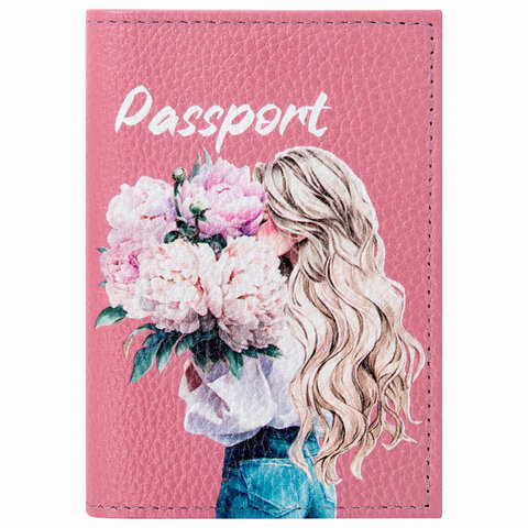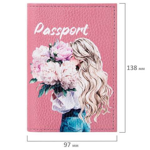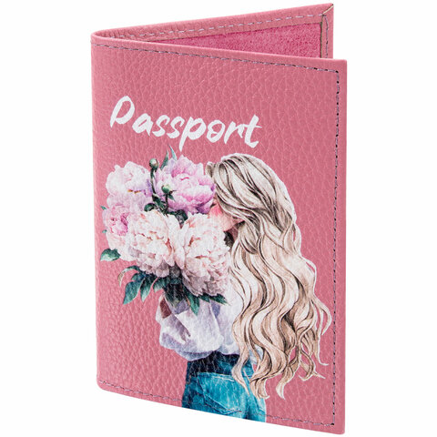 Обложка для паспорта натуральная кожа флоттер, принт "Девушка", цвет пудрово-розовый, BRAUBERG, 238868