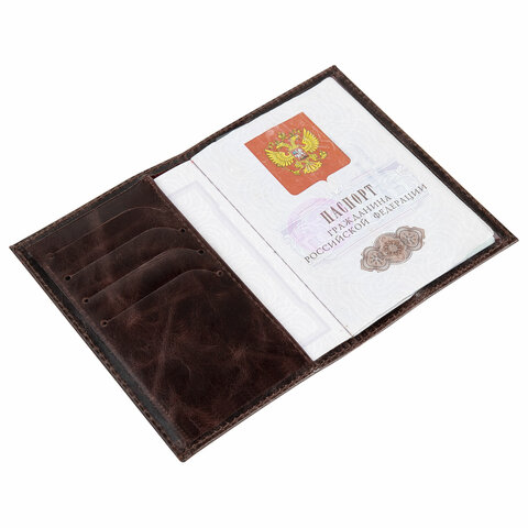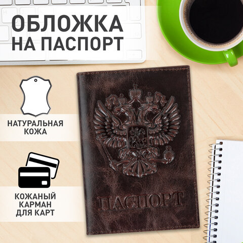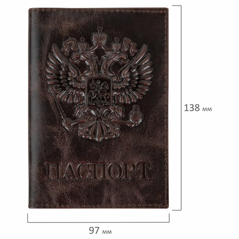 Обложка для паспорта натуральная кожа пулап, 3D герб + тиснение "ПАСПОРТ", темно-коричневая, BRAUBERG, 238194