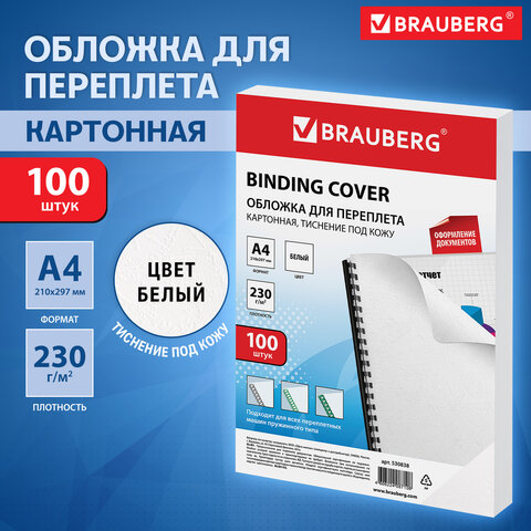 Обложки картонные для переплета, А4, КОМПЛЕКТ 100 шт., тиснение под кожу, 230 г/м2, белые, BRAUBERG, 530838