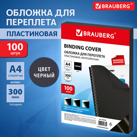 Обложки пластиковые для переплета, А4, КОМПЛЕКТ 100 шт., 300 мкм, черные, BRAUBERG, 530940