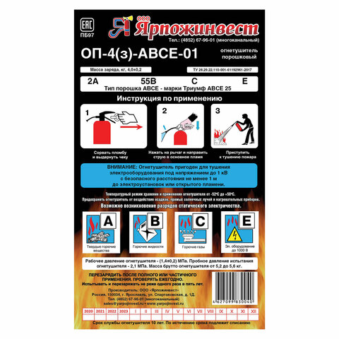 Огнетушитель порошковый ОП-4, АВСЕ (твердые, жидкие, газообразные вещества, электрические установки) закачной, ЗПУ Алюм, ЯРПОЖ, УТ-00001651