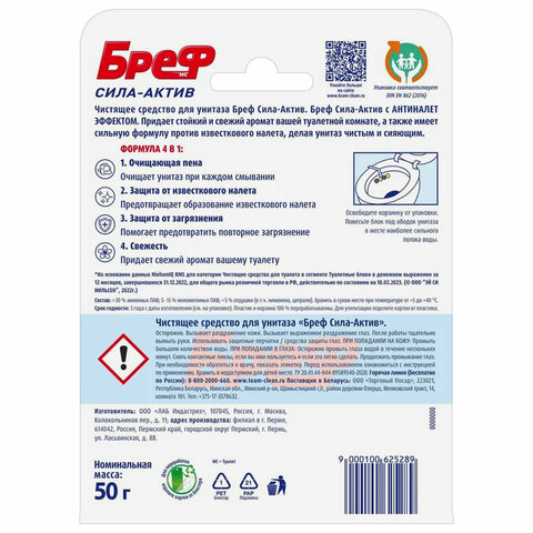 БРЕФ "Сила-Актив 4 в 1" – твердый туалетный блок нового поколения, который представлен в форме ярких разноцветных шариков. Формула 4 в 1 обеспечивает: гигиеническую чистоту, суперпену, защиту от известкового налета и устойчивый аромат лимонной свежести.